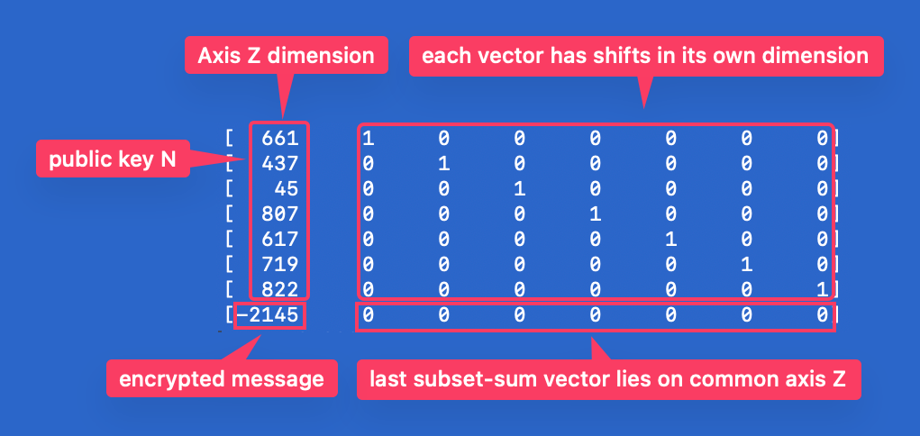 Because we are going to use LLL method which tries to find the smallest non zero vector in given Lattice. So when we combine all “right” vectors (right values from list $N$) we should get exactly subset-sum. And if we subtract sum of right values and given subset-sum (encrypted message) we should get 0. So final vector after LLL transformation will have 0 in axis Z and smallest possible numbers (only 0 or 1) in all other dimensions.