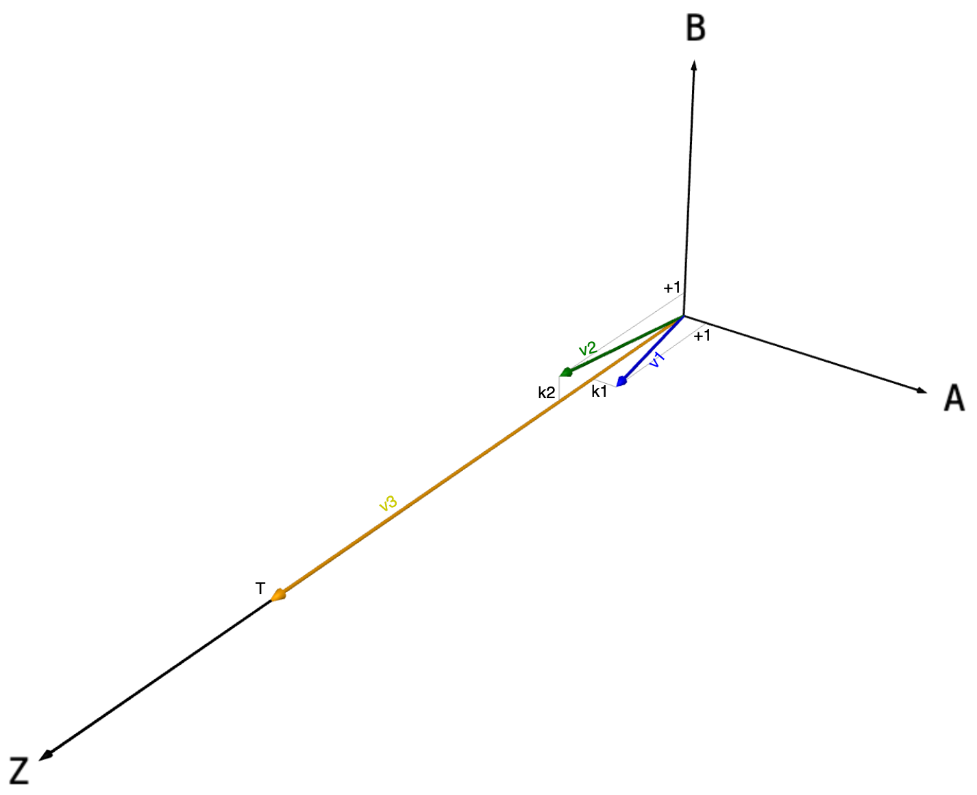 I drew how the basis vectors v1 (blue), v2 (green), and v3 (yellow) of my challenge could look in 3-dimensional space.